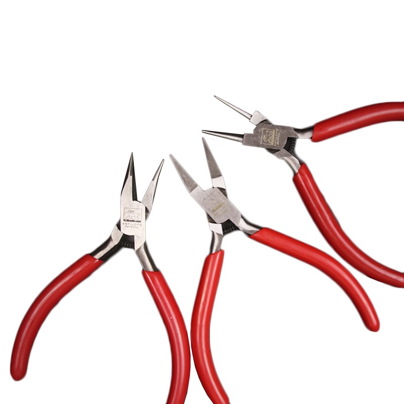 These pliers feature stainless steel construction with PVC handles, offering durability and comfort for jewelry repair and wire wrapping tasks.