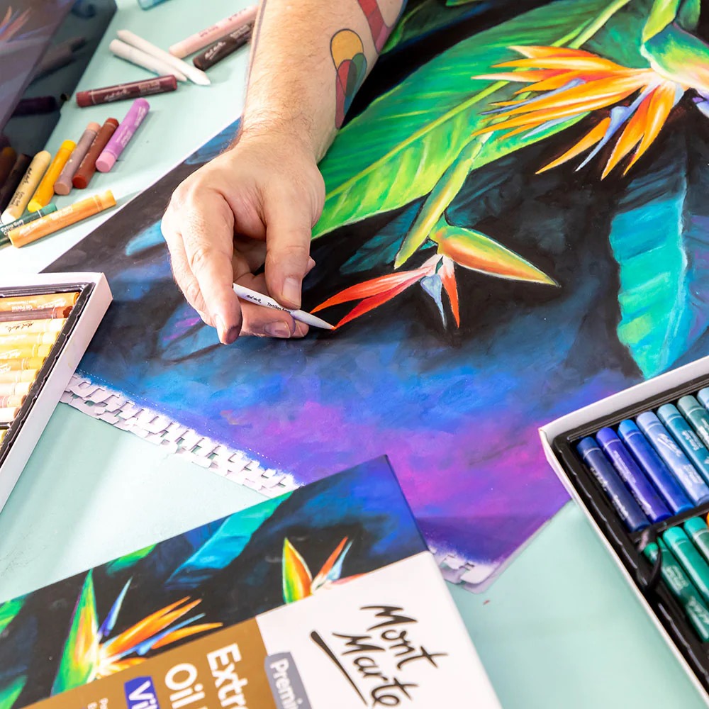 Create bold and vibrant artwork with our Extra Soft Oil Pastels 26pc. Inside this set are 24 rich oil pastel colours with two additional white pastels for creating extra highlights and colour combinations. The ultra-soft buttery texture gives you exceptional blending and clean colour mixing for a great result. Thanks to the highly blendable formula, it’s easy to work with a palette knife to achieve textural effects. Use them on a range of smooth or textured surfaces, including paper, card and canvas. Experiment and create interesting designs, patterns and techniques. You can even mix these art pastels with oil mediums or turps for a wet, glossy effect. Try something new, up your oil pastel game and give this ultra-soft formula a go for your next art or craft project.