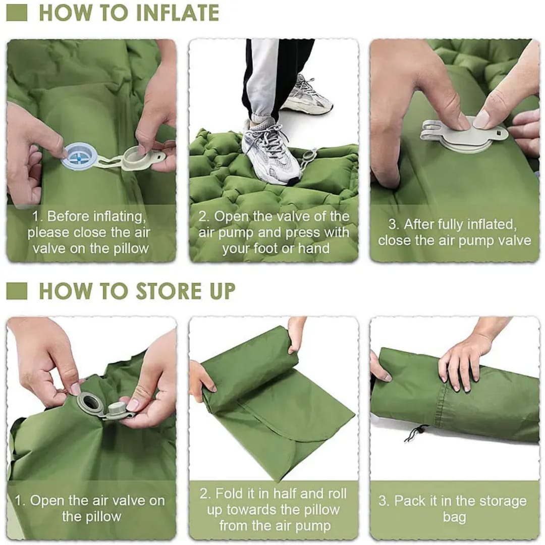 The ultra-light self inflatable sleeping pad is weighed and sized only like a water bottle. Inbuilt pillow saves you the trouble of carrying an extra one. This air mattress can easily fit in your backpack, perfect for hiking, camping, backpacking, traveling, climbing, hiking and other outdoor activities.