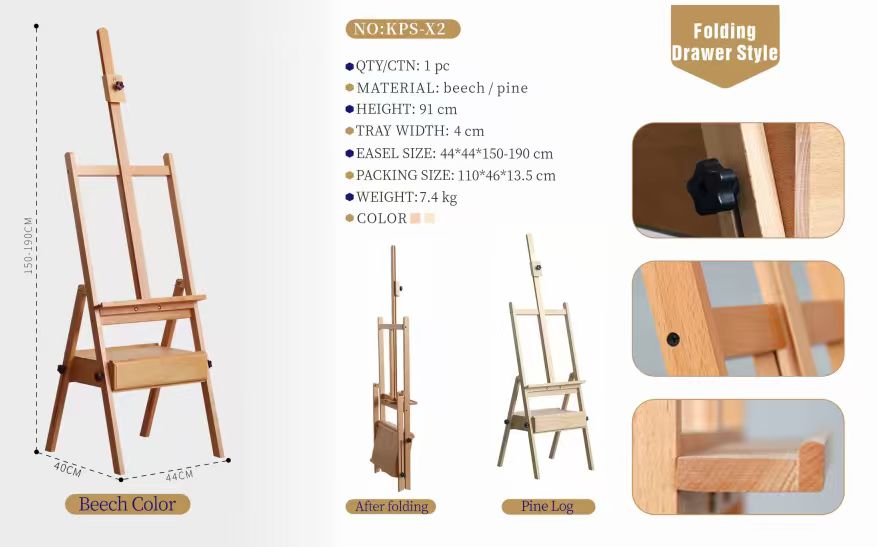 Made from strong, natural pine wood, this adjustable easel stretches from 150cm to 190cm and holds canvases up to 91cm tall. Its solid 7.4kg frame ensures stability for studio work, while the fold-out drawer keeps brushes, paints, and tools organized, so your creative space stays as focused as your vision.