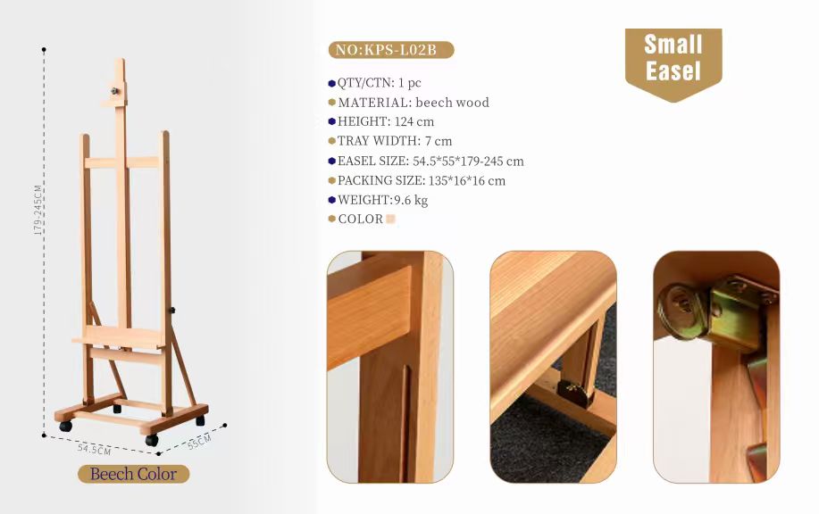 Engineered to hold canvases up to 124cm tall and 9.6kg in weight, this robust easel adjusts from 179cm to 245cm for optimal height and angle. Its sturdy frame makes it a reliable choice for studio sessions, gallery displays, and plein air painting.